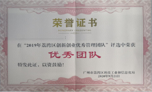 根據《荔灣區創新創業領軍人才創業發展優惠服務辦法》(荔府辦〔2015〕11號)要求和《2019年荔灣區創新創業優秀管理團隊評選申報指南》的有關規定,由荔灣區科技工業和信息化局主辦,通過權威專家團隊層層選拔,共評選出2個傑出團隊、4個優秀團隊和10個高端團隊。我司管理團隊位列優秀團隊首位。