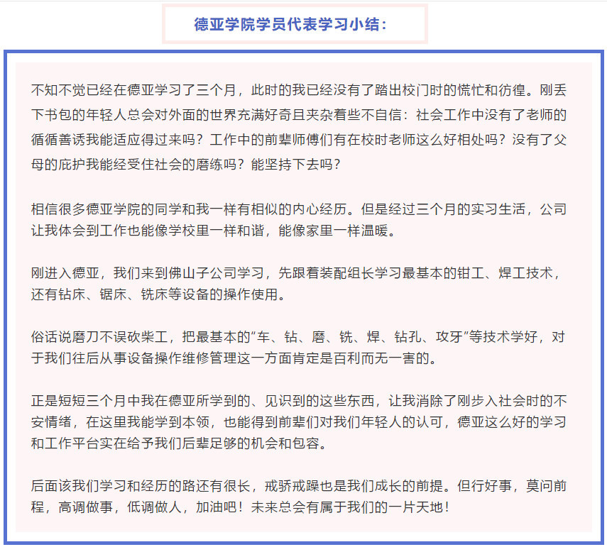 如今,2020年7月15日入學於德亞學院I期學員已度過三個月的學習生活,他們與入學初相比成長迅速。通過對PHC管樁行業的了解,對行業的發展前景充滿信心與希望,對個人未來發展定位明確,箭在弦上、蓄勢待發。