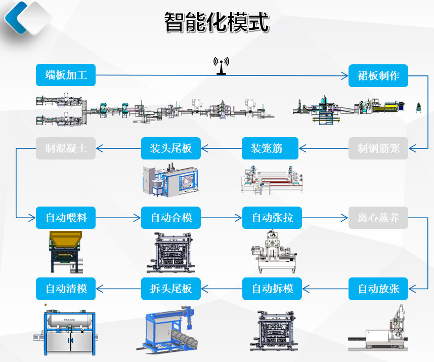 預應力混凝土智能生產線應用於建築行業預應力混凝土管樁的生產,由全自動喂料機、全自動合模機、全自動張拉機、全自動拆模機、全自動清模機、全自動裝頭尾板機、全quan自zi動dong裝zhuang籠long機ji等deng設she備bei組zu成cheng,各ge設she備bei具ju有you識shi別bie不bu同tong型xing號hao的de管guan樁zhuang規gui格ge,並bing自zi動dong調tiao整zheng相xiang應ying的de位wei置zhi及ji技ji術shu參can數shu,獨du立li完wan成cheng該gai工gong序xu的de工gong藝yi操cao作zuo要yao求qiu。