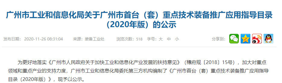 為加快提升製造業自主創新能力,培育以創新驅動為核心的裝備製造業新優勢,2020年由廣州市工業和信息化局組織開展的《廣州市首台(套)重點技術裝備推廣應用指導目錄(2020年版)》項目已公示,廣州德亞機械製造有限公司“預應力混凝土智能生產線”成功入圍。