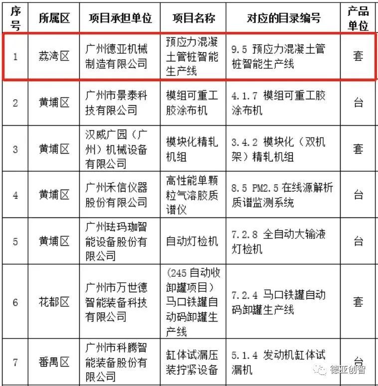 2022年,由廣州市工業和信息化局主辦,根據《廣州市工業和信息化局關於發布2022年廣州市促進工業和信息化產業高質量發展資金項目入庫申報指南的通知》(穗工信函〔2022〕15號)要求,通過層層評選,緊張角逐,優中選優,《2022年廣州市促進工業和信息化產業高質量發展資金首台(套)重點技術裝備推廣獎勵》方向項目評審結果已揭曉。共10家企業的創新項目入圍,廣州德亞機械製造有限公司預應力混凝土管樁智能生產線成功入選榜單。
