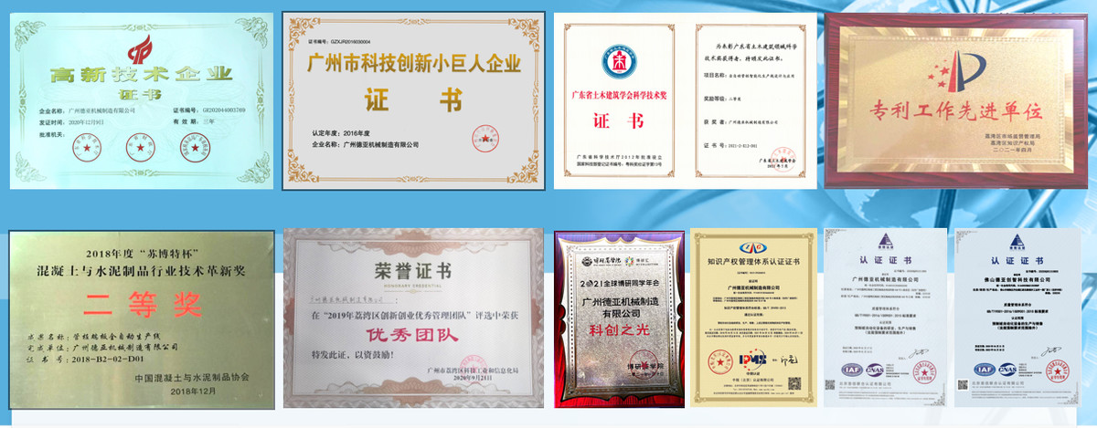 近年來,德亞創新發展成果顯著,先後獲得了中國混凝土與水泥製品行業“蘇博特杯”技術革新獎、中國建材機械工業協會技術革新獎、廣東省土木建築學會科學技術獎、廣東省知識產權示範企業、廣州首台(套)重點技術裝備推廣獎、廣州科技創新項目獎、發明專利產業化創新獎等殊榮。