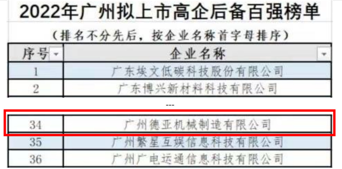 9月27日下午,2022年廣州擬上市高企百強榜單發布會在廣州順利舉行。廣州德亞機械製造有限公司在全市12000多家高企中脫穎而出,榮登“2022年廣州擬上市高企後備百強榜單”。