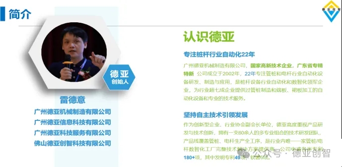廣州德亞機械製造有限公司董事長雷德意受邀以《新能源管樁智能化與數字化工廠》為主題講座。分析管樁行業瓶頸與樁杆製造痛點,提出解決出路:從傳統模式向智能化&數字化升級,打造樁杆行業新質生產力!