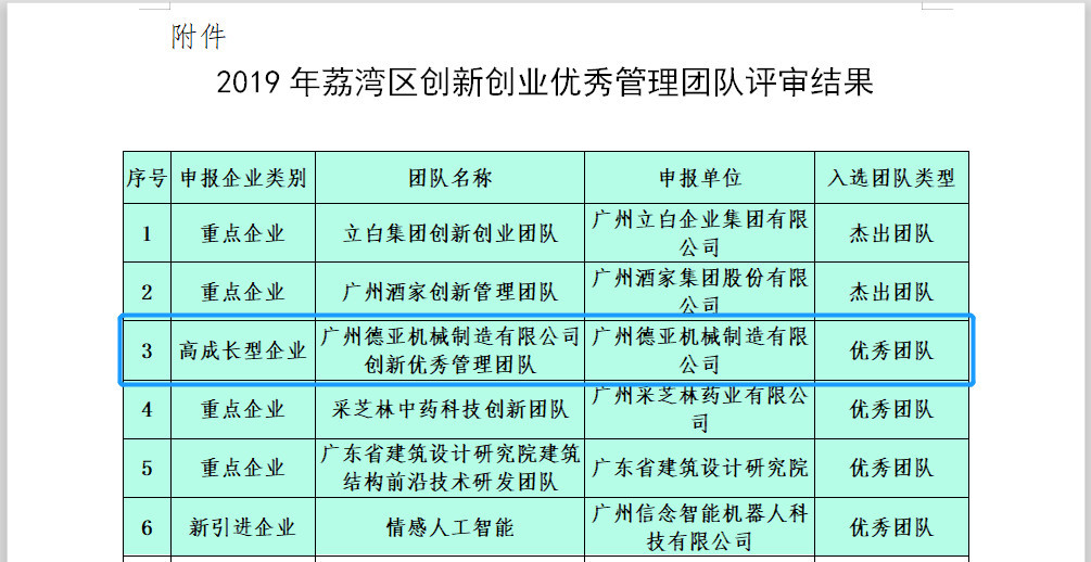 根據《荔灣區創新創業領軍人才創業發展優惠服務辦法》(荔府辦〔2015〕11號)要求和《2019年荔灣區創新創業優秀管理團隊評選申報指南》的有關規定,由荔灣區科技工業和信息化局主辦,通過權威專家團隊層層選拔,共評選出2個傑出團隊、4個優秀團隊和10個高端團隊。我司管理團隊位列優秀團隊首位。