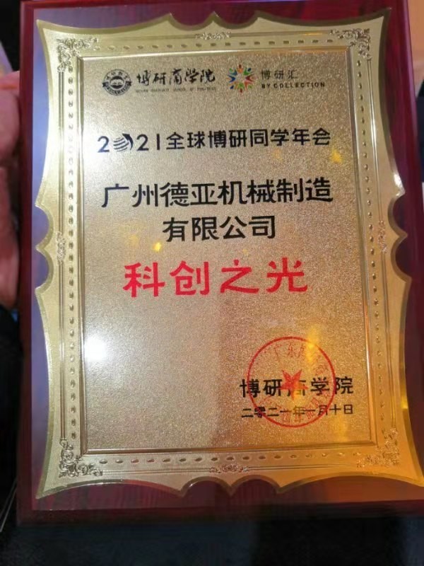 1月10日,“2021博研同學年會”授予10家具有行業代表性且具有科研成果影響力的企業“科創之光”獎牌,廣州德亞機械製造有限公司得此殊榮,並獲院士授牌。