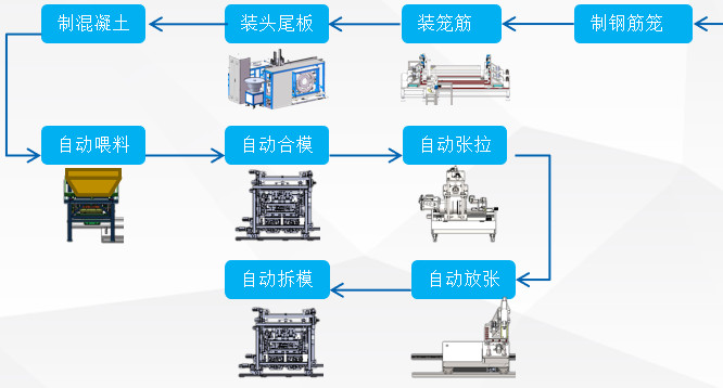 預應力混凝土管樁智能生產線包括全自動喂料機、全自動合模機、全自動張拉機、全自動拆模機、全自動放張機等,涉及37項獨創性專利,其中12項發明專利。同時這一係列自動化設備已具備智慧工廠的基因,硬件與軟件高度集成,能實現各種生產與設備實時數據、信息的自動采集,為智慧工廠的建設打下了堅實的基礎。
