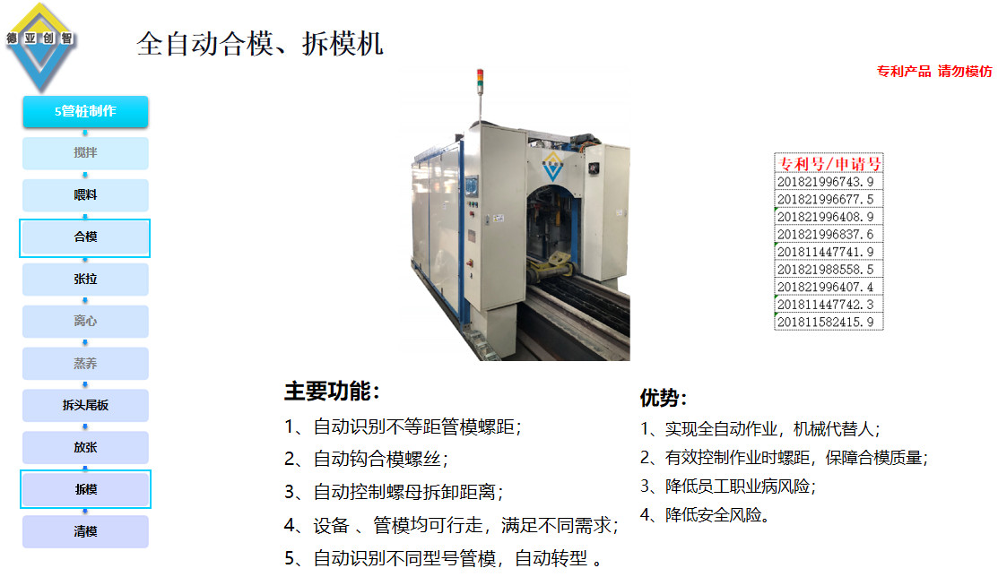 為配套“光伏樁”的應用,同時針對“光伏樁”直徑小、規格跨度小等特點,公司先後研發出一係列經濟實用的專用設備:全自動裙板一體機、全自動喂料機、全自動合模機、全自動張拉機、全自動拆模機、全自動放張機、全自動拆頭尾板機、全自動清模機等;按智能程度分為半自動、全自動;以滿足不同客戶的需求,為PHC管樁在光伏產業中的應用保駕護航。