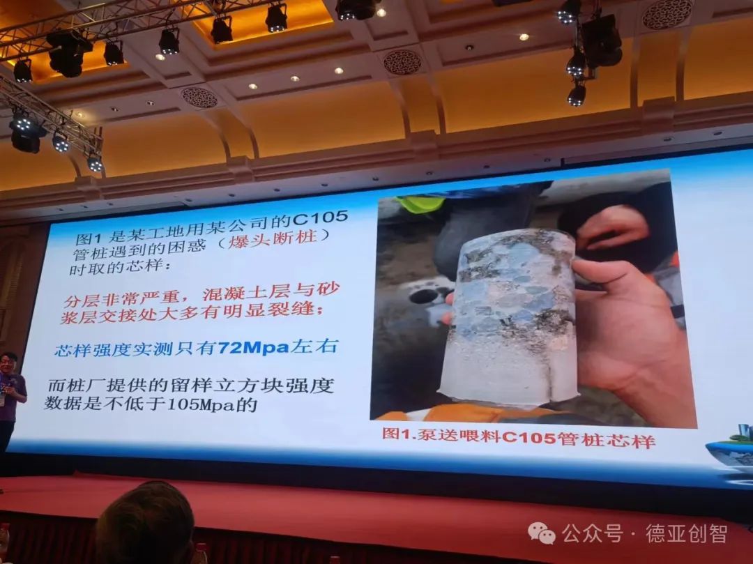 薑正平教授幽默又犀利地指出PHC管樁製造存在的問題,幹貨滿滿。對泵送喂料工藝實物鑽心取樣深入淺出地分析混凝土分層問題,對學術執著、認真負責的態度讓人尊敬。